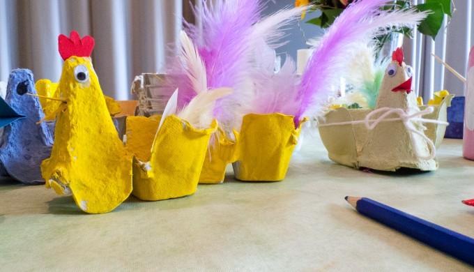 Wir hören eine lustige Ostergeschichte, basteln Frühlingsdeko und färben bunte Ostereier.